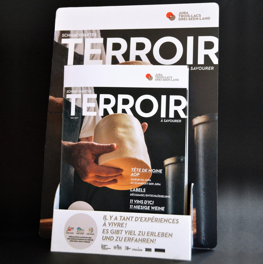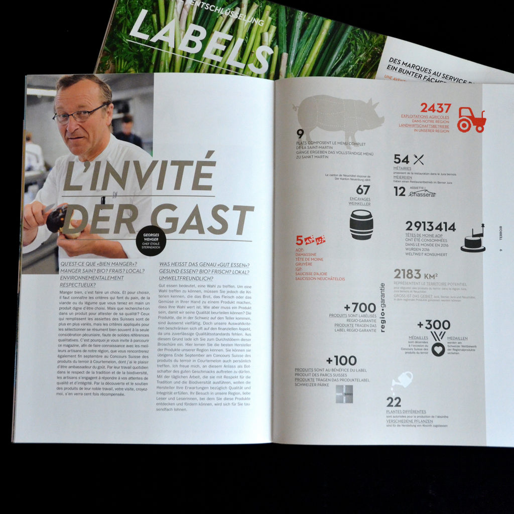 Huit organisations se sont regroupées pour valoriser les produits du terroir de l’Arc jurassien à travers un magazine bisannuel. Notre mandat : élaborer un concept de magazine (création et mise en page) en accord avec la charte graphique de Jura & Trois-Lacs. Le numéro 2 est sorti comme prévu, 24 mois après. De même, une petite série d’annonces dans le Temps, pour mettre en avant des activités extraordinaires.
